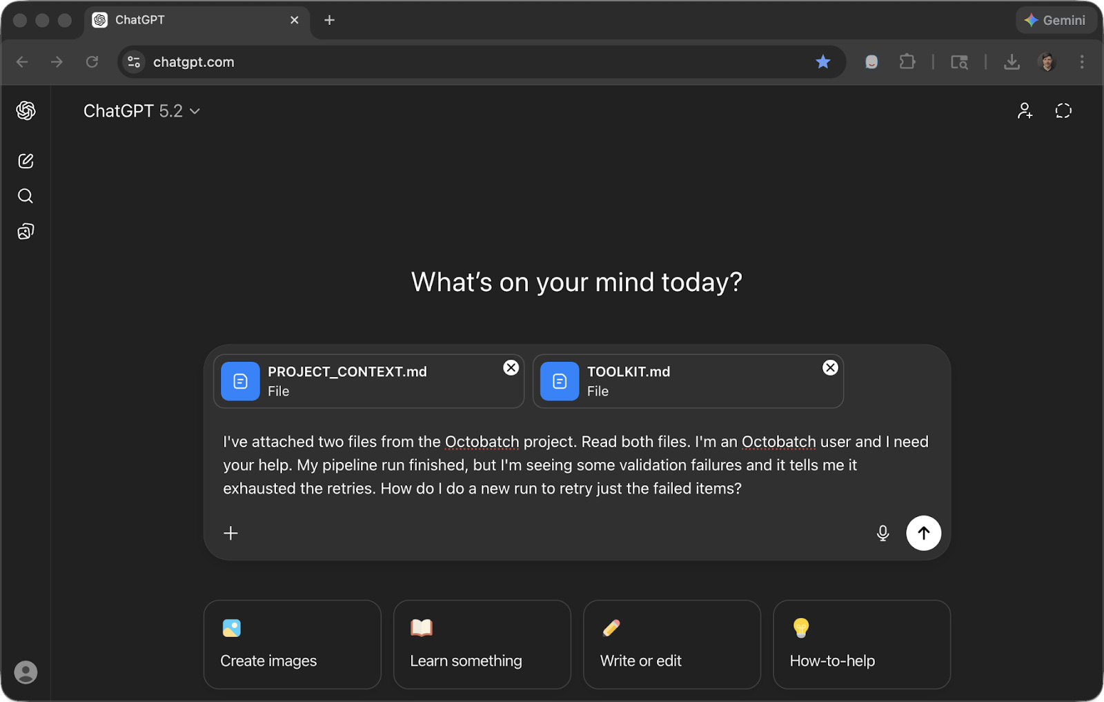 But configuration generation is only half of what the toolkit file does. Users can also upload TOOLKIT.md and PROJECT_CONTEXT.md (which has information about the project) to any AI assistant—ChatGPT, Gemini, Claude, Copilot, whatever they prefer—and use it as interactive documentation. A pipeline run finished with validation failures? Upload the two files and ask what went wrong. Stuck on how retries work? Ask. You can even paste in a screenshot of the TUI and say, “What do I do?” and the AI will read the screen and give specific advice. The toolkit file turns any AI into an on-demand support engineer for your project.